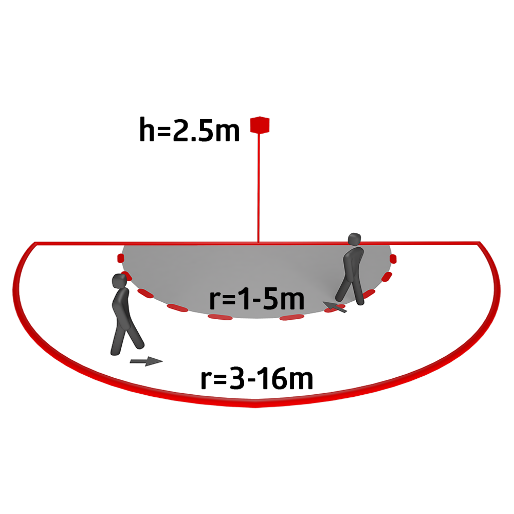Angle de détection : 180° (montage mural) - 16m transversal - 5m frontal - 3m anti-reptation