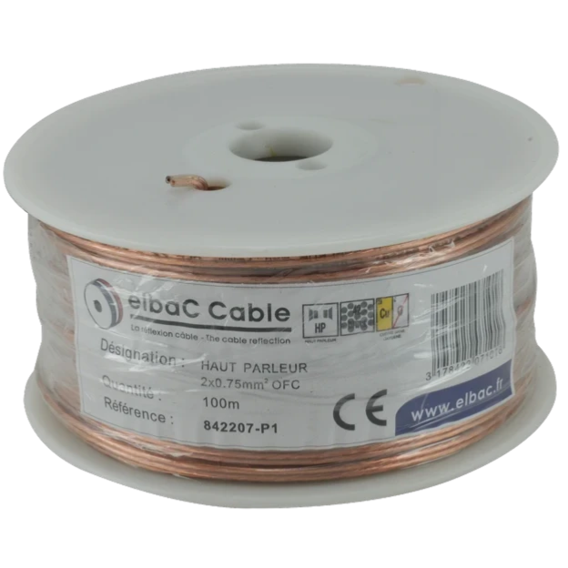 Câble haut parleur en 2 conducteurs de 0,75mm² en couronne de 100 mètres prévu pour les installations de sonorisations, raccorder des enceintes.