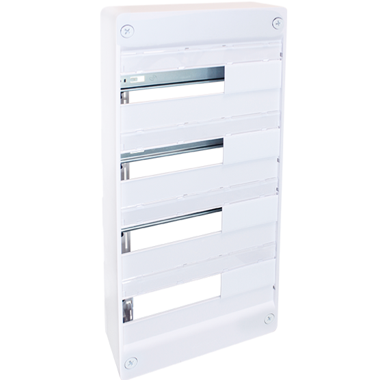 Coffret pour logement et petit tertiaire de 13 modules par rangée, pour un total de 52 modules pour 4 rangées.