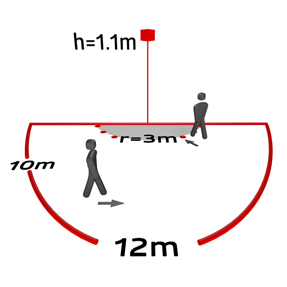 - Portée : max. 10 m pour un mouvement transversal / max. 3 m pour un mouvement frontal